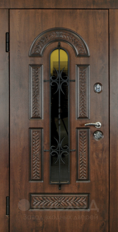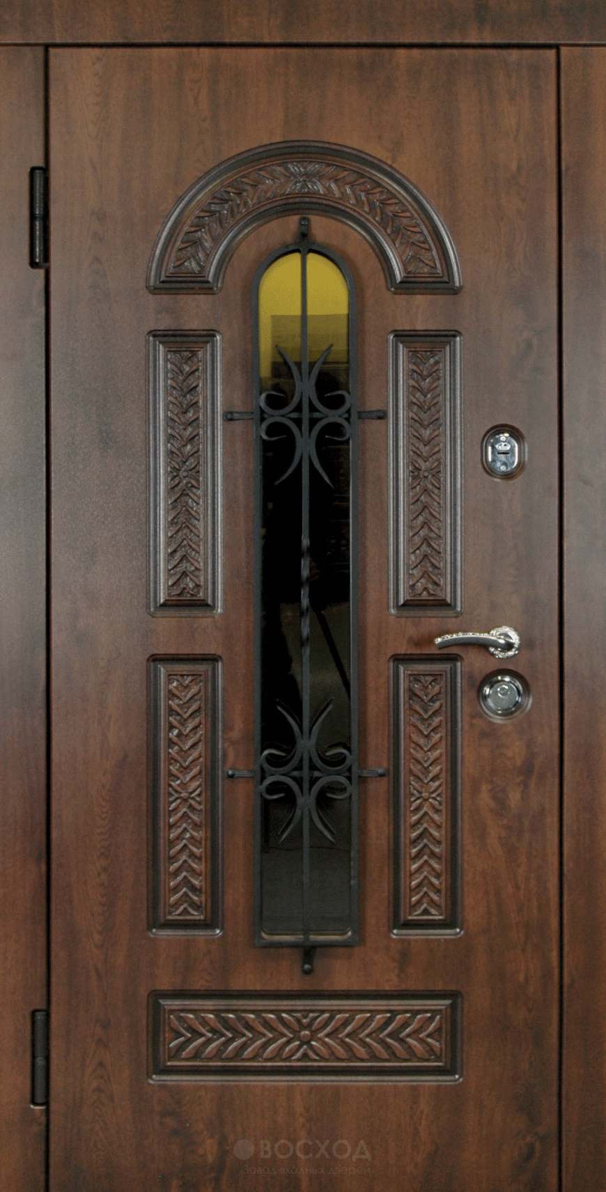 Эта металлическая дверь станет надежным выбором для вашего частного дома или коттеджа. Изготовленная с учетом всех современных требований безопасности и комфорта, она включает терморазрыв в коробке и полотне, что эффективно защищает от холода и влаги. Внешняя и внутренняя отделка выполнены из массива дерева, придавая двери элегантный вид, стойкость к механическим повреждениям и долговечность. Особое внимание стоит уделить элементам ковки, которые подчеркивают уникальность дизайна. Прочные замки с тремя ригелями (сувальдный и цилиндровый) обеспечивают высокий уровень безопасности. Конструкция из оцинкованной стали с усиленными ребрами жесткости и многослойной тепло- и шумоизоляцией гарантирует долговечность и защиту от внешних факторов. Дополнительно возможно комбинировать отделку, установить стеклопакет или зеркало, а также подобрать замки по индивидуальному запросу.