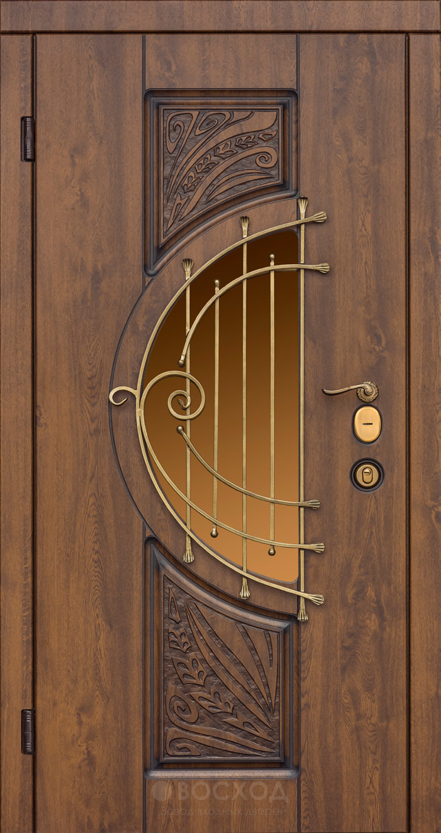 Дверь со стеклом и кованой решеткой №24 — это вариант для тех, кто хочет совместить эстетику и безопасность. В основе конструкции прочный каркас из профильной трубы с металлическим листом толщиной 2 мм и рёбрами жёсткости, поэтому полотно держит форму и не боится нагрузок. Центральный акцент — стеклопакет, дополненный декоративной ковкой: через него в дом проникает свет, но при этом решётка служит надёжным барьером, сохраняя приватность и защищая от нежеланных гостей. Отделка выполнена панелями МДФ с ПВХ-покрытием, которое отличается стойкостью к механическим повреждениям и долговечностью, не теряя привлекательности даже спустя годы эксплуатации. Два контура уплотнителей удерживают тепло и защищают от сквозняков, а при необходимости конструкцию можно дополнить утеплителем. Такая дверь органично впишется в фасад дома, подчеркнув вкус хозяев и обеспечив уверенную защиту.