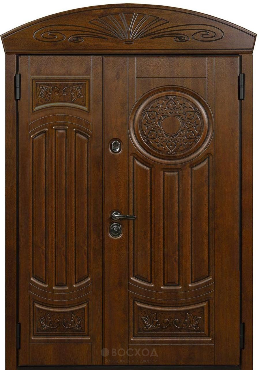 Арочный проем всегда выглядит эффектно, а дверь с аркой из МДФ в дом №27 делает его еще более выразительным. Прочная металлическая основа из стали толщиной 2 мм и профильных труб надежно защищает вход, а декоративные панели МДФ ПВХ добавляют эстетики и стойко переносят ежедневные нагрузки, сохраняя аккуратный вид долгие годы. Арочная форма визуально вытягивает фасад, придавая ему благородство и индивидуальность, а двухстворчатая конструкция обеспечивает удобство при эксплуатации — от ежедневного использования до заноса крупногабаритных предметов. Два контура уплотнения помогают защитить дом от сквозняков, а при желании можно усилить дверь шумо- и теплоизоляцией. Дополнительные элементы вроде ковки, стеклопакета или зеркала делают модель гибкой в плане дизайна, позволяя воплотить уникальное решение, которое подчеркнет архитектуру и характер частного дома.