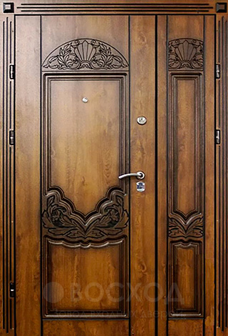 Дверь входная в частный дом двойная №100 – выбор для тех, кто ценит масштаб и выразительность фасада. Две створки позволяют не только подчеркнуть статусность коттеджа, но и обеспечивают удобство при заносе крупной мебели или техники. Основа конструкции выполнена из профильной трубы и листа стали толщиной 2 мм, что придаёт жёсткость и долговечность. Внешняя и внутренняя отделка массивом дуба создаёт ощущение солидности, а заодно защищает поверхность от случайных царапин и деформаций. Дуб сохраняет привлекательный вид десятилетиями, не боится перепадов температуры и влаги, поэтому такая дверь уместна именно в загородном доме. Двойной контур уплотнителей обеспечивает базовую защиту от сквозняков, а при необходимости дверь можно дооснастить утеплителем. Это решение объединяет эстетику парадного входа и надежность металлической конструкции, превращая входную группу в настоящее архитектурное украшение.